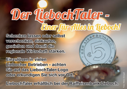 Einzulösen in vielen Liebocher Betrieben (z.B. BILLA, BIPA, Kraftplatzerl, Apotheke, Musikschule u.v.w. - achten Sie auf das LiebochTaler-Logo oder erkundigen Sie sich vor Ort).
